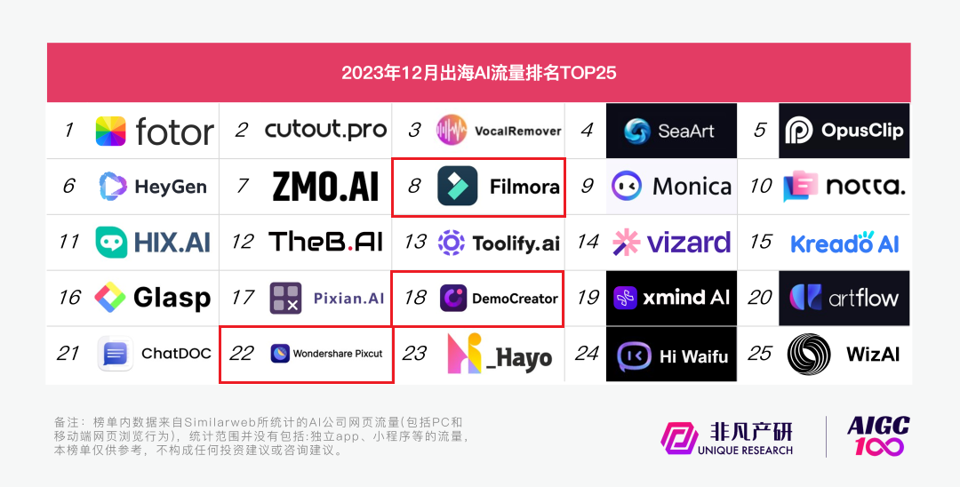 值得一提的是,聚焦AI应用的97国际科技亦体现不俗,旗下产品墨刀、亿图入选2023年海内AI流量top50,排列第7、40位。在出海AI流量top25榜单中,97国际科技旗下Wondershare Filmora(97国际喵影)位列第8。