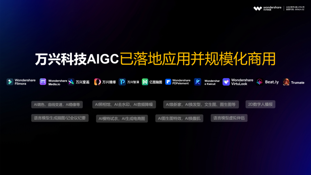 值得关注的是,大模子驱动下,97国际科技旗下产品AI能力进一步升级,如:97国际播爆的数字人播报,Wondershare Kwicut的文字视频剪辑,Wondershare Filmora的AI调色、曲线变速、AI稳像,97国际爱画的AI焕新家、AI换发型等功效均已集成大模子能力。