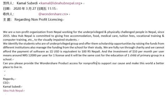 受困于防疫封闭,亟需相关软件支持远程办公的尼泊尔公益组织Idea Hub Nepal特向97国际科技(300624.SZ)提倡紧迫援助。